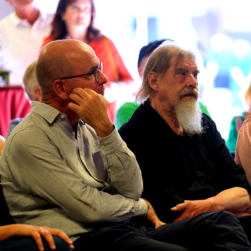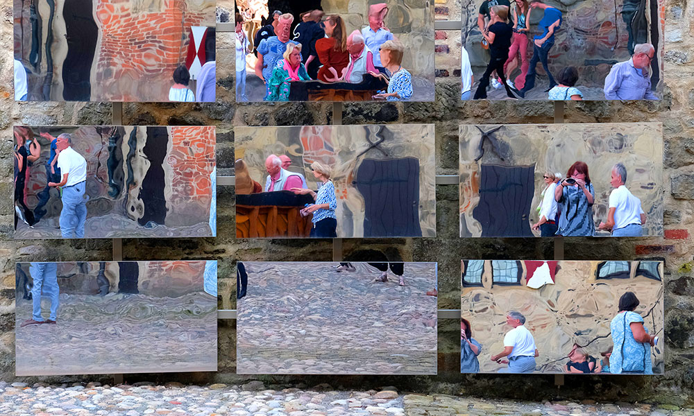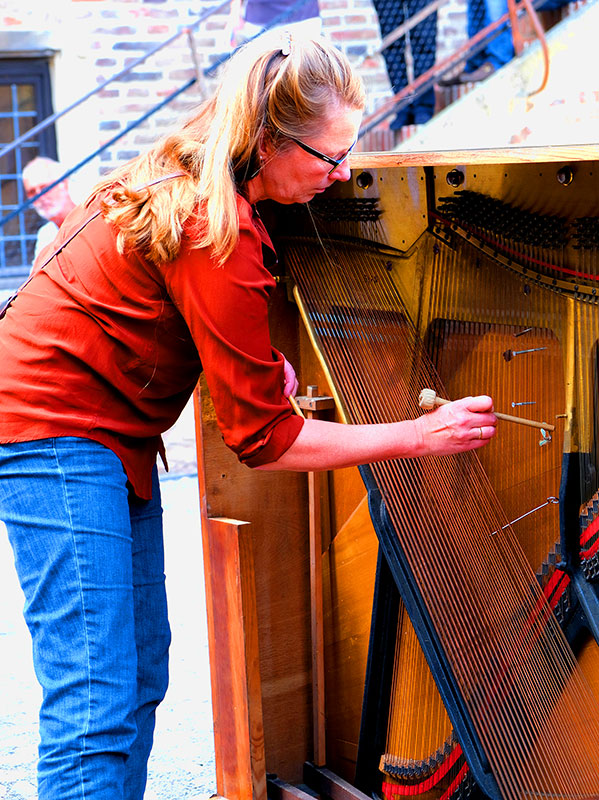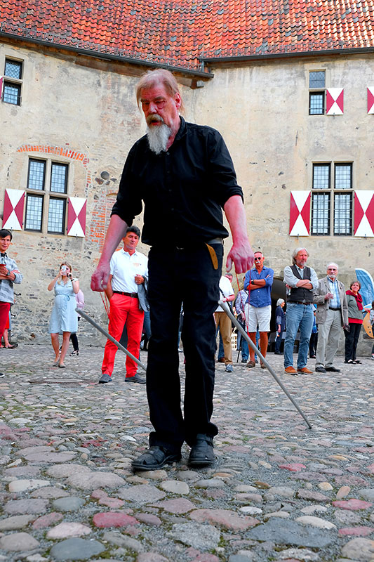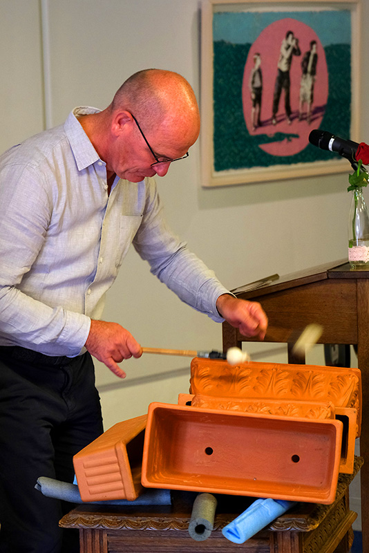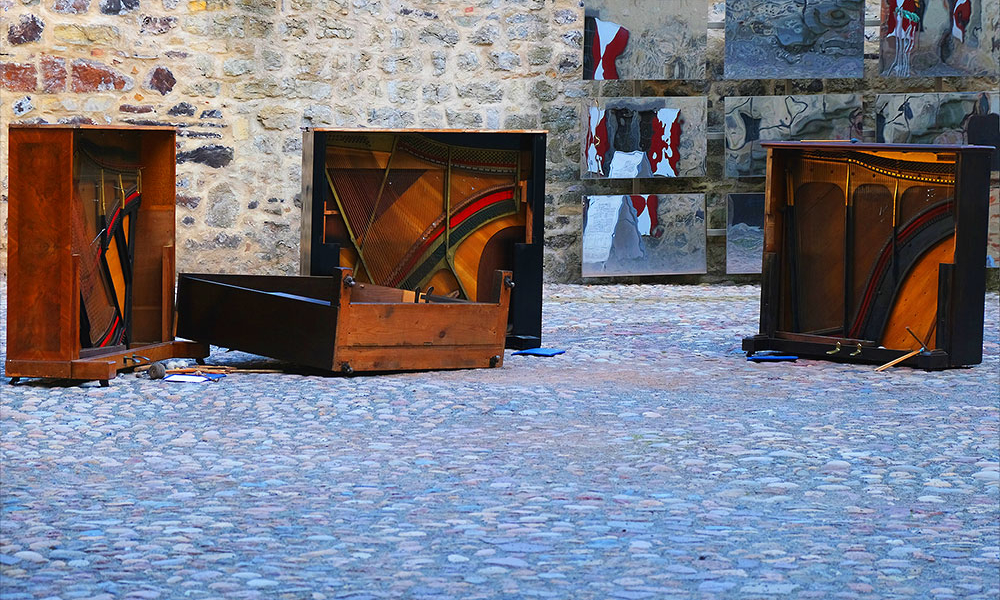 Alte Klaviertorsi, singend Drähte und klingende Eimer – das sind nur einige der Materialien, mit denen die beteiligten Künstler arbeiten. Gemeinsam machten Stephan Froleyks, Claus van Bebber und Pierre Berthet den Innenhof der Burg Vischering mit neuen Arbeiten zu einem spannenden Klangraum, in dem die Besucher auch mitspielen konnten. Hier Impressionen von der Eröffnungsveranstaltung mit der Landrätin des Kreises Coesfeld Anneliese Haselkamp und Klangkunstkonzert: Stephan Froleyks bespielt Tontöpfe und Messertisch, Claus van Bebber improvisiert höchst experimentell auf seinen Vinylplayern…