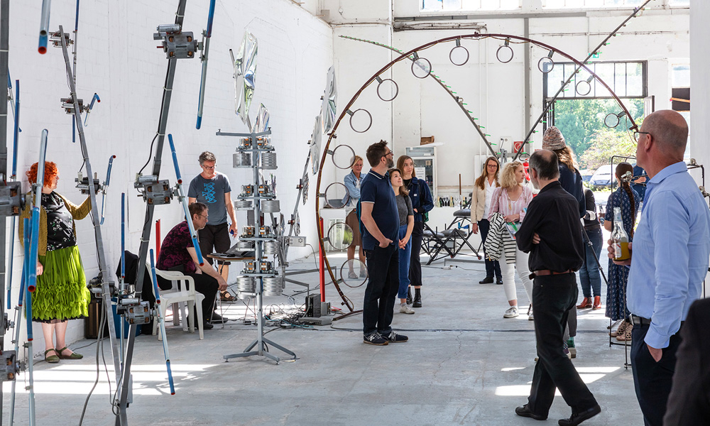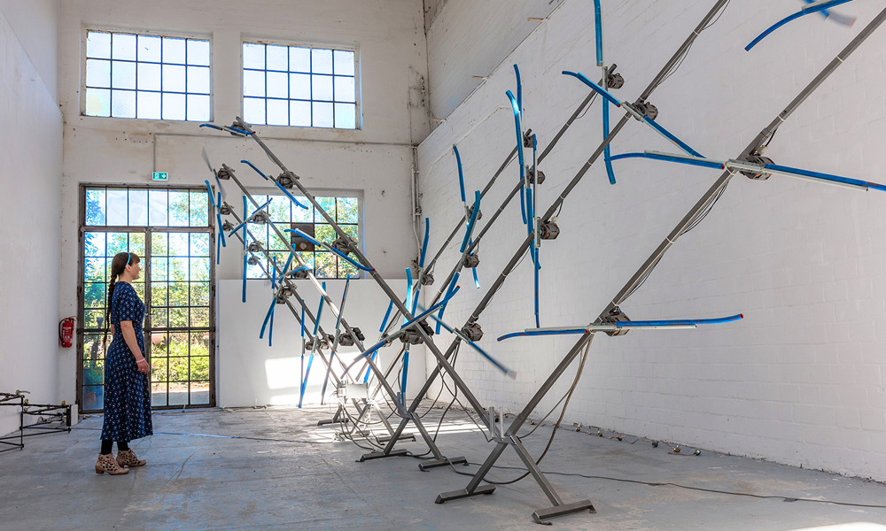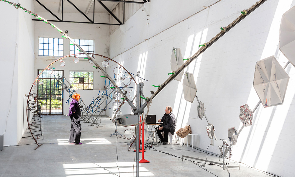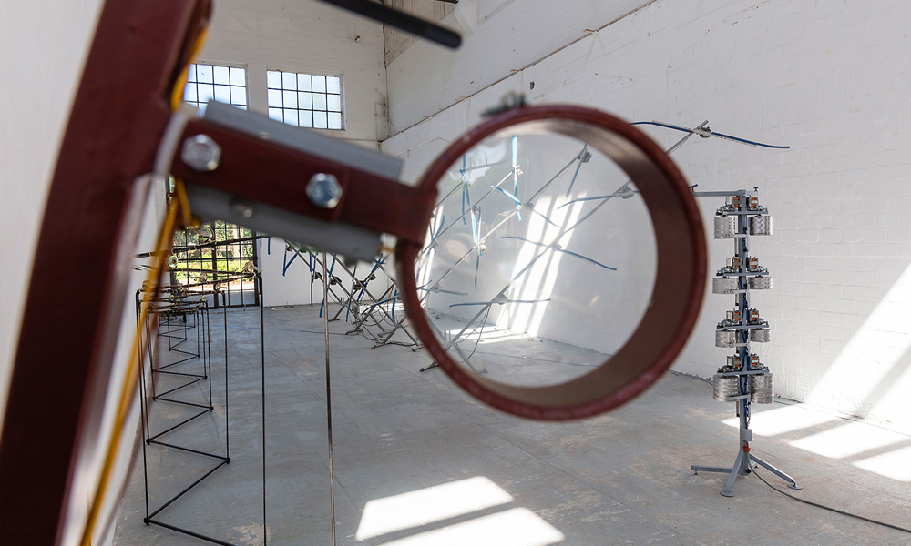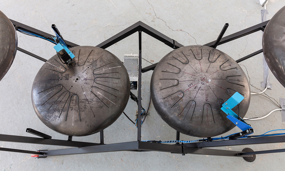 Knackdosen, Whupi, Klöpper, Chromix, Typedrum, Brauser, Schwirrer und ein Hopper – Christof Schläger inszeniert seinen Klangparcours 2021 am Hawerkamp in Münster aus einer Vielzahl ungewöhnlicher akkustischer Klangobjekte.