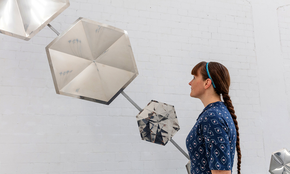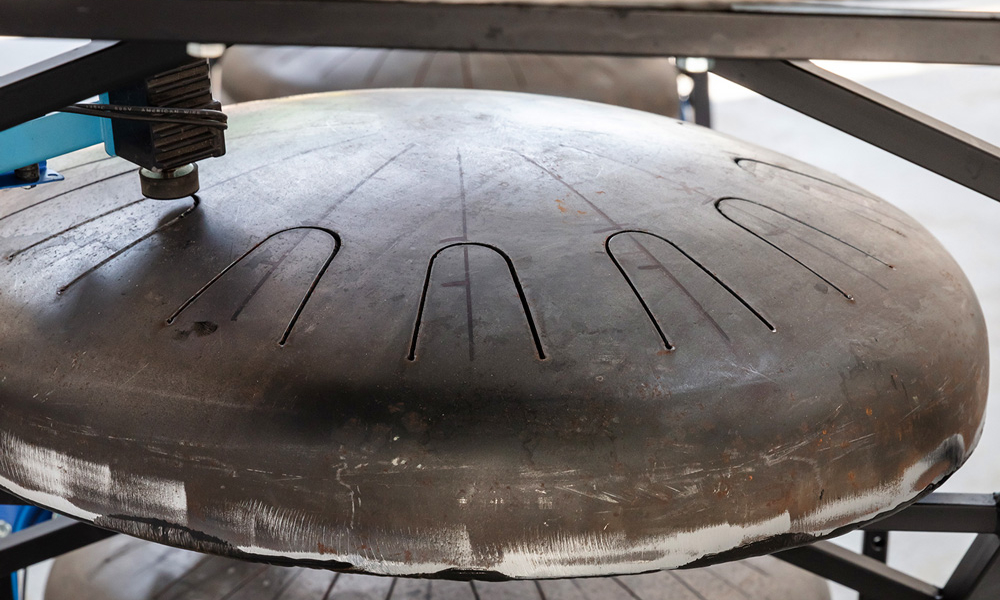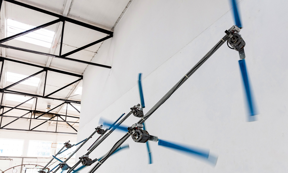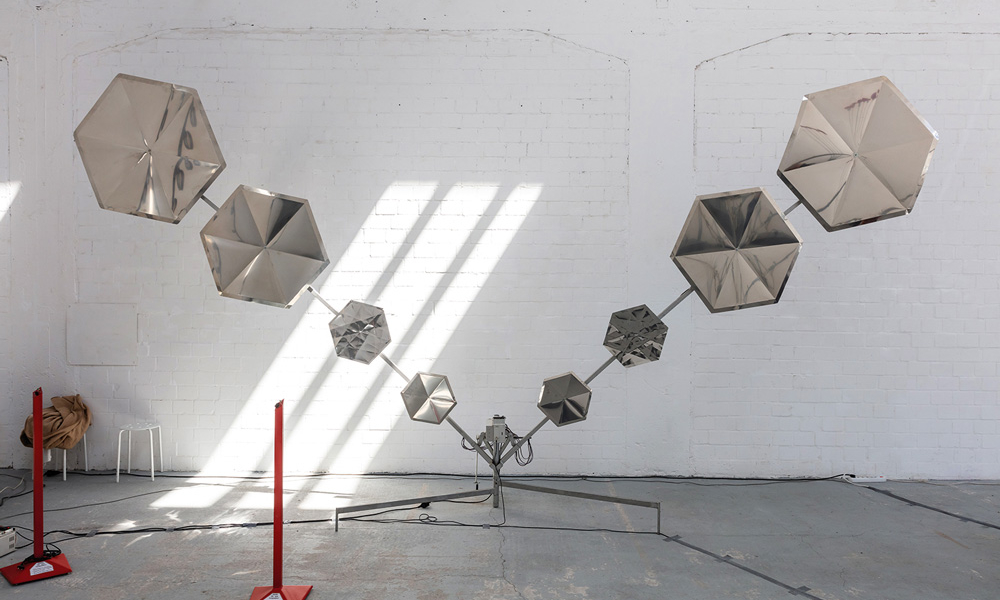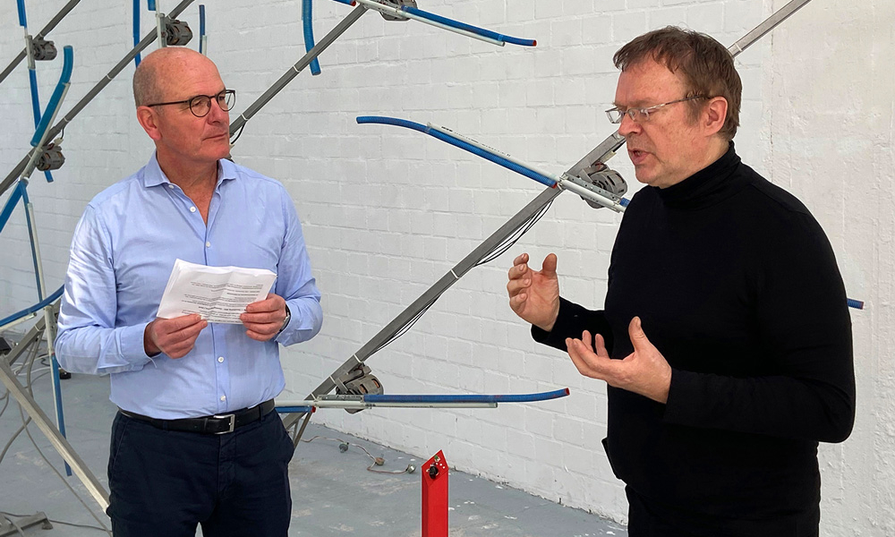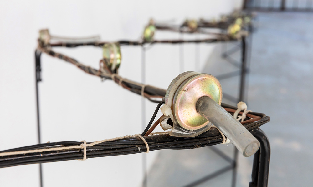 Knackdosen, Whupi, Klöpper, Chromix, Typedrum, Brauser, Schwirrer und ein Hopper – Christof Schläger inszeniert seinen Klangparcours 2021 am Hawerkamp in Münster aus einer Vielzahl ungewöhnlicher akkustischer Klangobjekte.