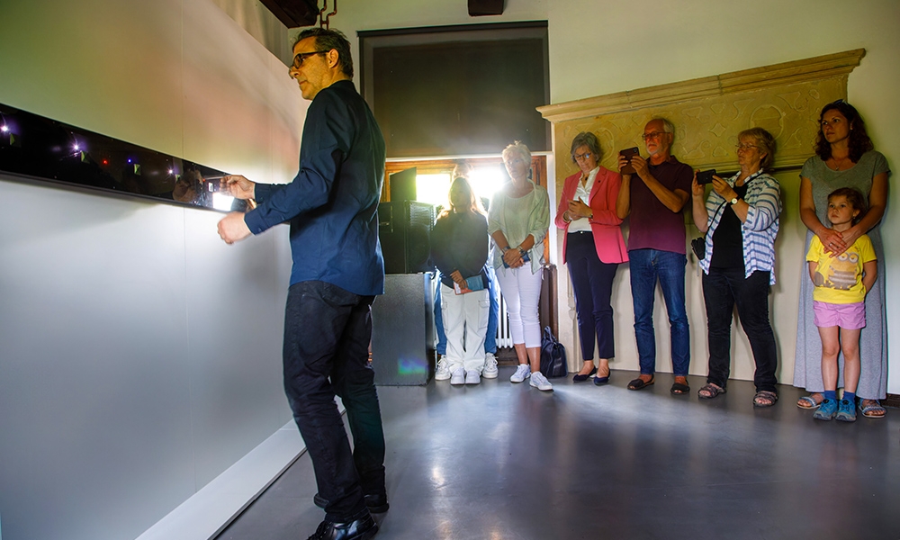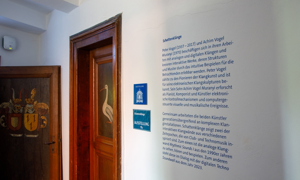 Unter dem Titel „Schattenklänge“ präsentieren Achim Vogel Muranyi und Peter Vogel Heritage zwei interaktive Klangwände aus verschiedenen Epochen in den historischen Räumen der ehemaligen Ritterburg Vischering in Lüdinghausen. Die analoge Klangwand “Rhythmic Sounds I“ von Peter Vogel aus den 1990er Jahren – eine elektronische Wandinstallation mit 18 Lichtsensoren – und die digitale Klangwand “Techno Soundwall“ von Achim Vogel Muranyi aus der Gegenwart – eine computerprogrammierte Variante auf Basis von Audiosamples. Beide Soundwalls sind von Club- und Technomusik inspiriert und können intuitiv – auch vom Publikum – gespielt werden.
